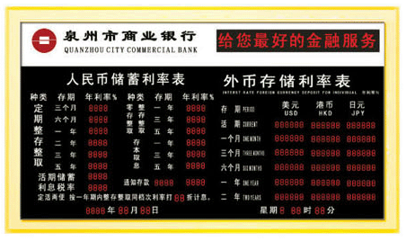 一、利率、汇率的主要功能包括以下几个方面: 显示功能: 利率显示 可显示本币存款与外币存款利率,储蓄种类与利率信息自定。 汇率显示 可显示外汇牌价与实盘买卖牌价,数据库联网实现动态显示。 文字显示 可选用 16/24/32 点阵条屏显示中英文各种字体,多种方式。 时间显示 可显示年、月、日、星期、时、分、秒等。 温度显示 接入温度传感器,显示屏可显示当前温度。 湿度显示 接入湿度传感器,显示屏可显示当前湿度。 编辑控制: 接联机编辑 屏体留有微机接口,接入微机,可对屏体信息进行编辑;另可通过网络联机远程控制。 小键盘编辑 可在屏体上配装调节按键盒,用小键盘对屏体信息进行编辑。 遥控编辑 可配红外或无线遥控器,用遥控的方式对屏体信息进行编辑。 内容固化 对于固定不变信息,可采取将内容固化到芯片锁定显示内容。 保护功能: 自动开关 可任意设定开机、关机时间。到时,屏体可自动开关电源,以节省电力资源。 掉电保护 屏体在停电或掉电时,当前显示的信息内容不会丢失。 二、条形屏的主要功能简介: 系统特具脱机运行功能,即在显示内容编辑制作完成并发送至显示屏之后,便可关闭控制机。 可滚动和多种方式显示用户所要显示的不同内容。 显示内容存储方式有长驻、暂驻和实时等。 显示内容由用户在电脑上设计制作后,通过串口(一般为RS232口)发送至屏幕显示。 信息显示和编辑界面为Windows98/NT/XP界面,Borland C﹢﹢编程。 通讯线采用双绞线,抗干扰能力强,通讯距离可达到300米,255块条型屏一机联网控制。 我公司是最早开发舞台字幕屏厂家之一,现以性能稳定、品种齐全、功能卓越、几乎是免维护的可靠质量而深受欢迎。本着"人无我有,人有我优"的工作信念,生产的各种舞台字幕屏(条型屏),除具以上常用条型屏所有功能外,还拥有一些其特殊的功能优势: 结构简单:屏体厚度才6cm,重量很轻,装卸自由 携带方便:可折叠,尤如行礼箱。 字型美观:可显示多种字体的中文(简体字与繁体字)和英文 显示方式:灵活多样,如:上滚,中分,中合,左移,右移等。 运行速度:按键即可马上将剧本内容送到显示屏,也可据用户的要求自行调节。 控制方式:可横向,竖直,也可横竖同时只用一台电脑控制 |